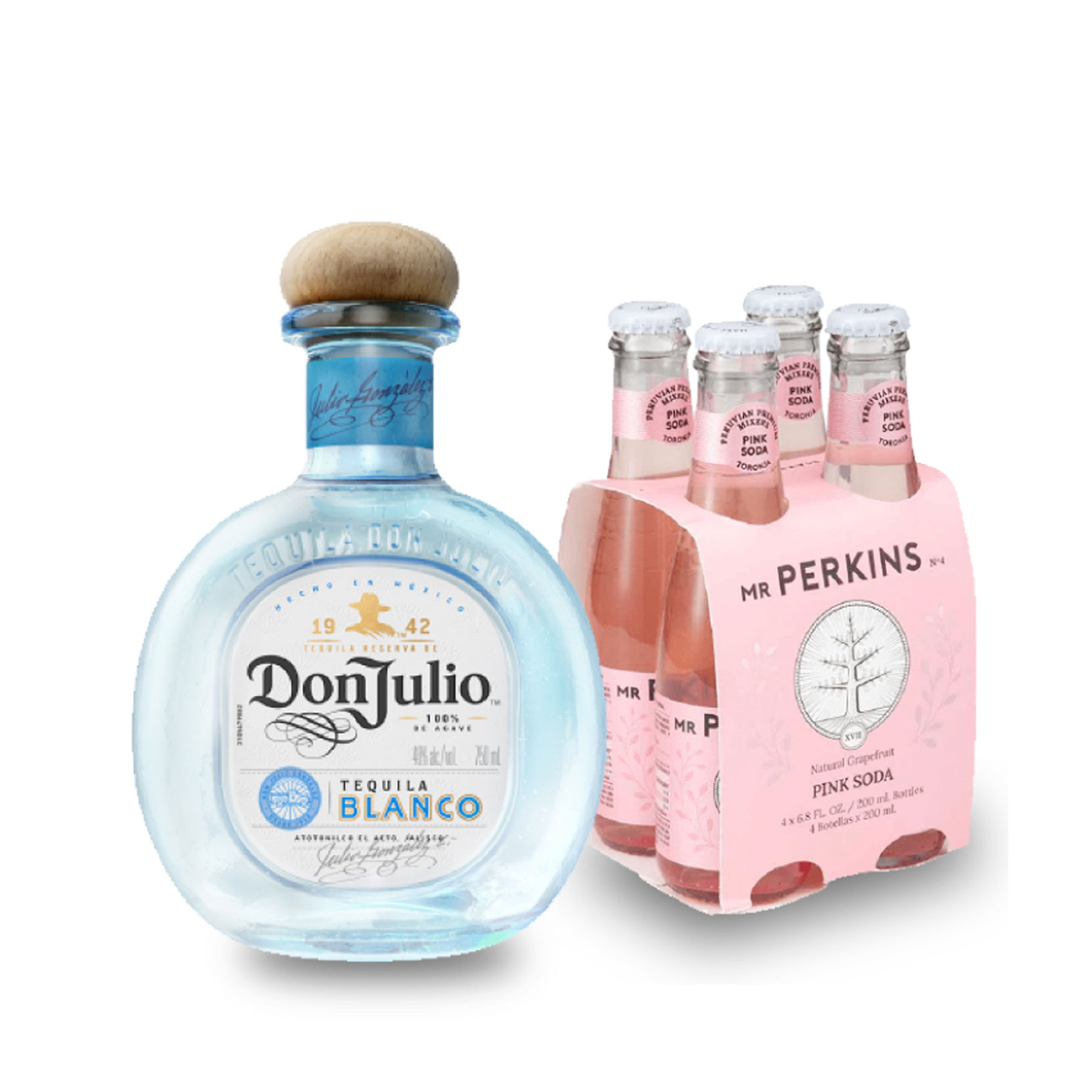 / TEQUILA DON JULIO BLANCO X 750 ML + FOUR PACK MR. PERKINS PINK SODA X 200 ML
